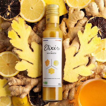 Elixir par Socrate est un concentré de pur jus de gingembre, citron et miel . À utiliser en shot detox le matin, dans une tisane le soir, pour façonner vos cocktails ou encore sublimer vos recettes en cuisine. Polyvalent, pur, fonctionnel.